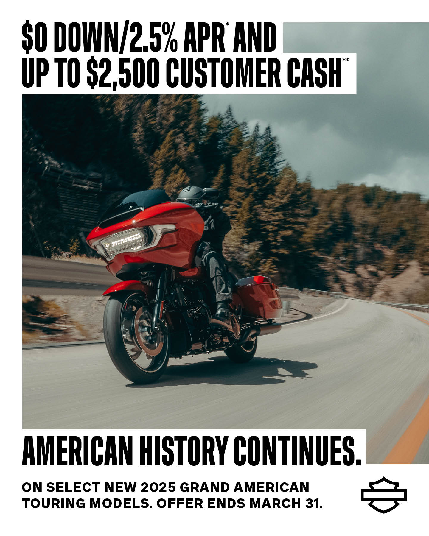 CUSTOMER CASH: 2,500 incentive valid towards the purchase price of select new, untitled Road Glide and Street Glide Ultra motorcycles, $1,750 incentive valid towards the purchase price of select new, untitled Street Glide motorcycles, all available and in stock at participating H-D® dealers in the continental U.S. including Hawaii and Alaska. At participating dealers only. Offer valid on purchases made on and between January 1, 2026 to March 31, 2026. Offer cannot be used towards the down payment on a motorcycle. Offer not valid on previous purchases or future motorcycle orders after March 31, 2026. Please see your authorized Harley-Davidson® dealership to determine what offers, discounts or promotions, such as Harley-Davidson finance offers, can be combined with this Offer. Offer is subject to change at any time without notice. Void where prohibited or restricted by law. Cannot be redeemed for cash or cash equivalent and is non-refundable.