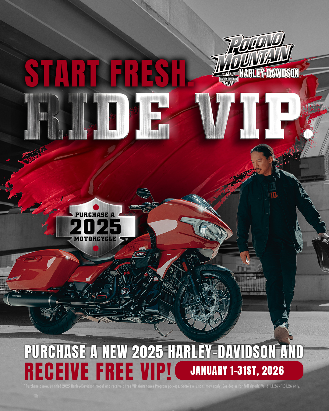 Customers who purchase a new, untitled 2025 Harley-Davidson model during the promo window will receive a FREE VIP Maintenance Program package.